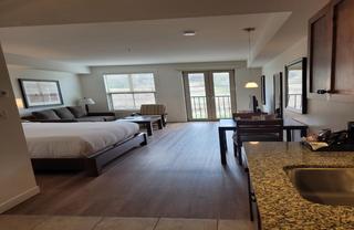 Chardonnay Studio Suites feature an open concept layout. This studio suite features one king bed, one queen sofa bed, flat screen TV, a fully equipped kitchenette, tub with shower. The room has a view of the mountains and Lake Osoyoos, through the trees. Walnut Beach Resort offers a private, lake front sandy beach, year round heated pool, 2 hot tubs and a gym. Boat moorage while you stay. Green space for game...