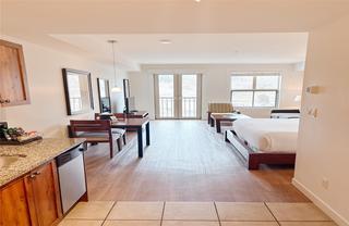 Cabernet Two Bedroom Suite sleeps 6 people. The Suite features one king bed in the primary bedroom with an ensuite, a second bedroom features a queen size bed plus an additional queen-size pull-out sofa bed, flat screen TV's, a fully equipped kitchen, in-suite laundry, electric fireplace, and a four-piece bathroom. A private balcony with seating to enjoy the peace and quiet, with mountain views and a glass o...